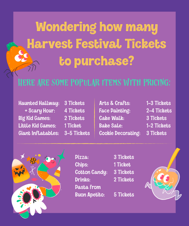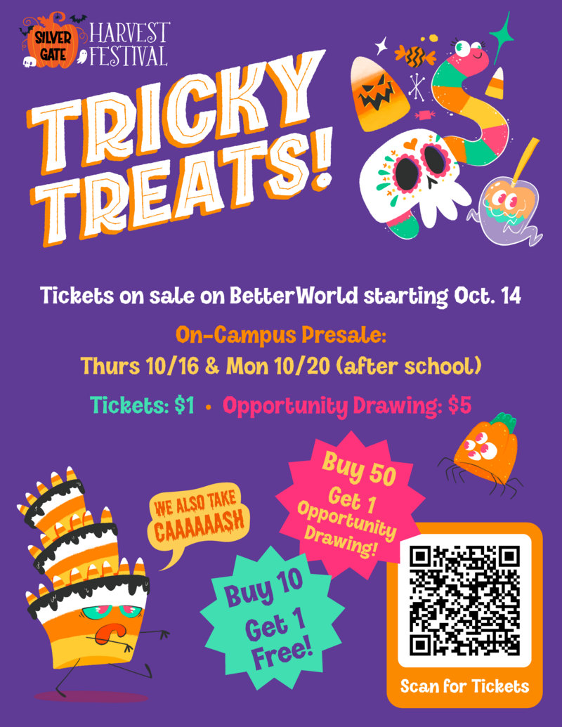 Admission to the event is free, and ticket prices for booths and games range between 1-5 tickets, including drinks, snacks, bake sale and pizza! Online presale available through Wednesday 10/22. In-person pre-sales will occur at Silver Gate on Thursday 10/16 after school and Monday 10/20 before school & during Monday assembly on the blacktop.